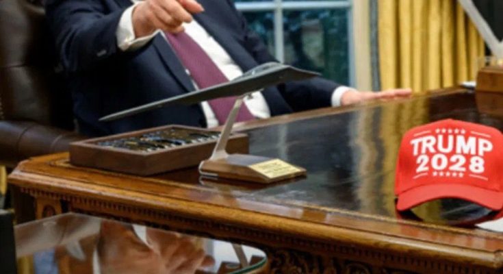 As he met with Democratic leaders on Monday (September 29) to discuss ways to prevent a government shutdown, the president was seen in the Oval Office wearing ‘Trump 2028’ hats.